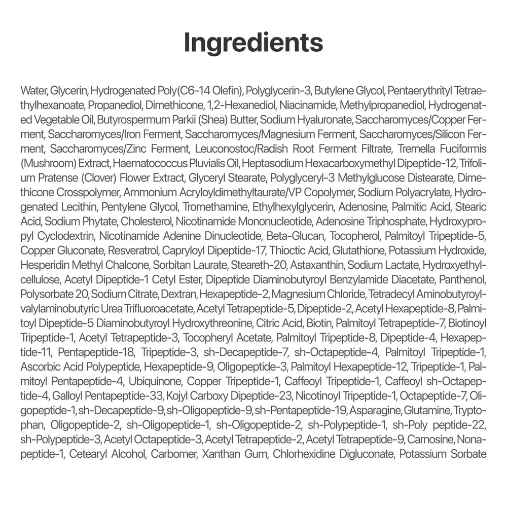 Water, Glycerin, Hydrogenated Poly(C6-14 Olefin), Polyglycerin-3, Butylene Glycol, Pentaerythrityl Tetraethylhexanoate, Propanediol, Dimethicone, 1,2-Hexanediol, Niacinamide, Methylpropanediol, Cetearyl Alcohol, Glyceryl Stearate, Hydrogenated Vegetable Oil, Polyglyceryl-3 Methylglucose Distearate, Butyrospermum Parkii (Shea) Butter, Dimethicone Crosspolymer, Ammonium Acryloyldimethyltaurate/VP Copolymer, Sodium Polyacrylate, Hydrogenated Lecithin, Carbomer, Xanthan Gum, Pentylene Glycol, Tromethamine, Ethylhexylglycerin, Adenosine, Palmitic Acid, Stearic Acid, Sodium Phytate, Cholesterol, Sodium Hyaluronate, Adenosine Triphosphate, Hydroxypropyl Cyclodextrin, Nicotinamide Adenine Dinucleotide, Beta-Glucan, Tocopherol, Palmitoyl Tripeptide-5, Copper Gluconate, Saccharomyces/Copper Ferment, Saccharomyces/Iron Ferment, Saccharomyces/Magnesium Ferment, Saccharomyces/Silicon Ferment, Saccharomyces/Zinc Ferment, Capryloyl Dipeptide-17, Thioctic Acid, Leuconostoc/Radish Root Ferment Filtrate, Glutathione, Tremella Fuciformis (Mushroom) Extract, Haematococcus Pluvialis Oil, Potassium Hydroxide, Resveratrol, Hesperidin Methyl Chalcone, Sorbitan Laurate, Steareth-20, Astaxanthin, Sodium Lactate, Hydroxyethylcellulose, Acetyl Dipeptide-1 Cetyl Ester, Dipeptide Diaminobutyroyl Benzylamide Diacetate, Heptasodium Hexacarboxymethyl Dipeptide-12, Panthenol, Polysorbate 20, Sodium Citrate, Chlorhexidine Digluconate, Dextran, Hexapeptide-2, Magnesium Chloride, Tetradecyl Aminobutyroylvalylaminobutyric Urea Trifluoroacetate, Acetyl Tetrapeptide-5, Dipeptide-2, Potassium Sorbate, Acetyl Hexapeptide-8, Palmitoyl Dipeptide-5 Diaminobutyroyl Hydroxythreonine, Citric Acid, Biotin, Palmitoyl Tetrapeptide-7, Biotinoyl Tripeptide-1, Acetyl Tetrapeptide-3, Trifolium Pratense (Clover) Flower Extract, Tocopheryl Acetate, Palmitoyl Tripeptide-8, Dipeptide-4, Hexapeptide-11, Pentapeptide-18, Tripeptide-3, Sh-Decapeptide-7, Sh-Octapeptide-4, Palmitoyl Tripeptide-1, Ascorbic Acid Polypeptide, Hexapeptide-9, Oligopeptide-3, Palmitoyl Hexapeptide-12, Tripeptide-1, Palmitoyl Pentapeptide-4, Ubiquinone, Copper Tripeptide-1, Caffeoyl Tripeptide-1, Caffeoyl Sh-Octapeptide-4, Galloyl Pentapeptide-33, Kojyl Carboxy Dipeptide-23, Nicotinoyl Tripeptide-1, Octapeptide-7, Oligopeptide-1, Sh-Decapeptide-9, Sh-Oligopeptide-9, Sh-Pentapeptide-19, Asparagine, Glutamine, Tryptophan, Oligopeptide-2, Sh-Oligopeptide-1, Sh-Oligopeptide-2, Sh-Polypeptide-1, Sh-Polypeptide-22, Sh-Polypeptide-3, Acetyl Octapeptide-3, Acetyl Tetrapeptide-2, Acetyl Tetrapeptide-9, Carnosine, Nonapeptide-1